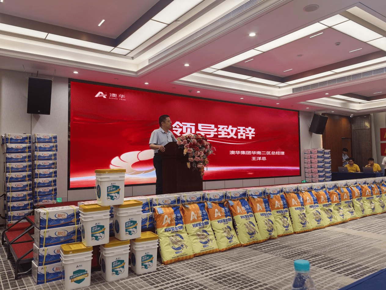 澳华集团华南二区总经理王洋致辞表示,尽管全球经济低迷、消费降级导致花虾价格下跌,但积极变革与澳华合作的养殖户通过升级模式和高价值产品(如虾奶粉、花虾安康等),抗住了消极的经济环境带来的压力。未来澳华将继续通过创新产品、高效模式及一体化服务,持续为养殖户创造价值。