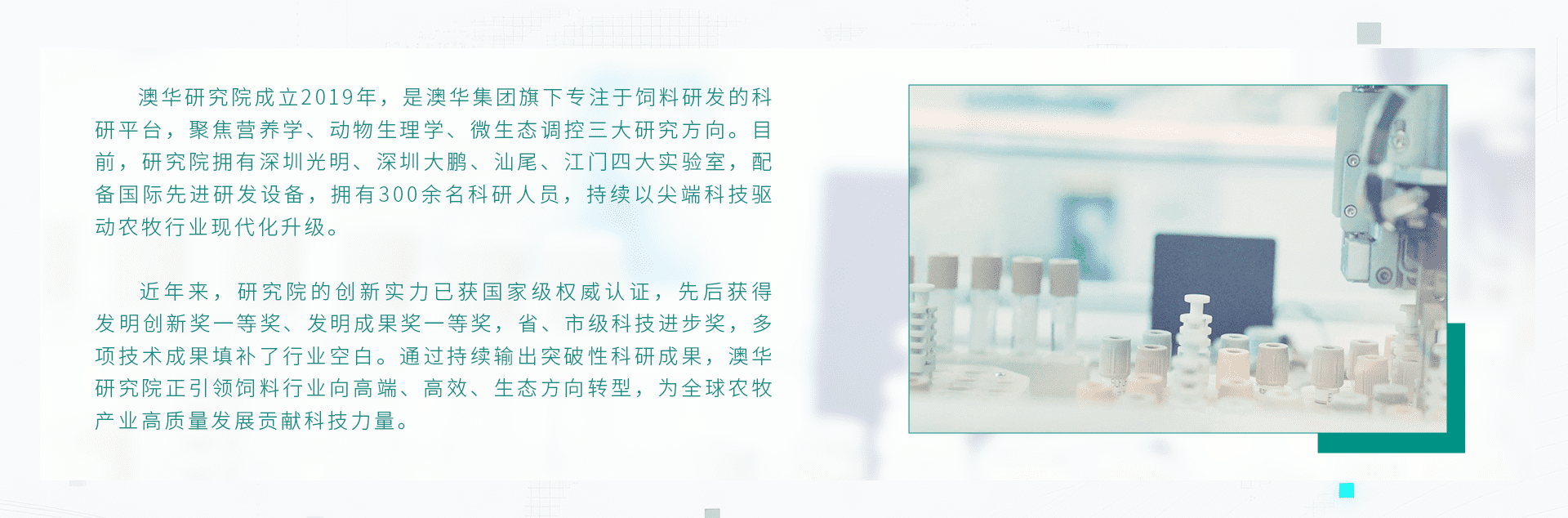 澳华研究院 科研合作 与国内知名大学、组织长期建立产学研合作,联合中国科学院建立 “ 高效环保水产养殖 ” 联合实验室;与中国农业大学联合成立澳华 “ 院士工作站 ” ,把更高端、前沿的研发成果产品化规模化,实现 “ 高端高效 ” 的价值承诺。 我们与各顶尖院校及院士、科学家成立合资公司、合作实验室,研发技术创新能力强。 中国科学院深圳先进技术研究院建立 “ 高效环保水产养殖联合实验室 ” 中国农业大学李德发院士成立 “ 院士工作站 ” 广东海洋大学 华南农业大学 华中农业大学 南京农业大学 上海海洋大学 中国海洋大学 研发成果